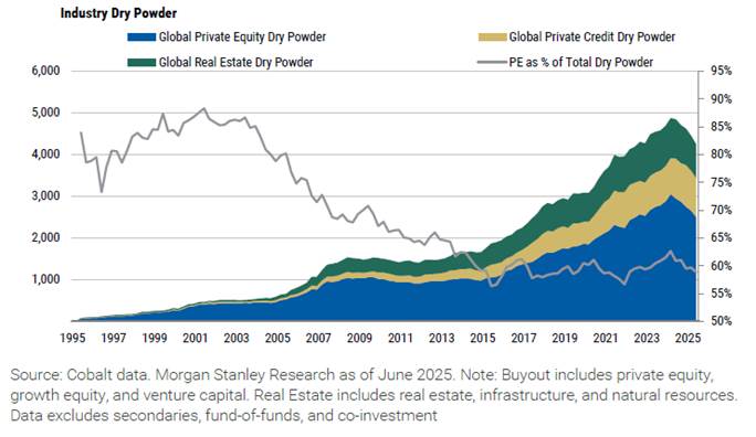 El capital privado está sentado en cash: el conjunto de mercados privados gestiona 13,7 billones de dólares con 4,2 billones en disponibles para operaciones (31% del total), lo que equivale a ~8 billones de poder de compra considerando apalancamiento. Aunque esa cifra ha descendido desde máximos por menor fundraising y más distribuciones, la base sigue siendo colosal y el tono directivo en gestoras líderes (BX, KKR, Brookfield) se ha tornado más constructivo, con pipelines crecientes y salidas que comienzan a acelerar respecto a 2023.