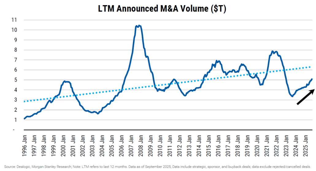 Tras unos años donde hemos visto pocas fusiones en 2025 hemos comenzado a ver un repunte significativo, y creemos que podemos estar en un nuevo ciclo de fusiones y adquisiciones, M&A en inglés.