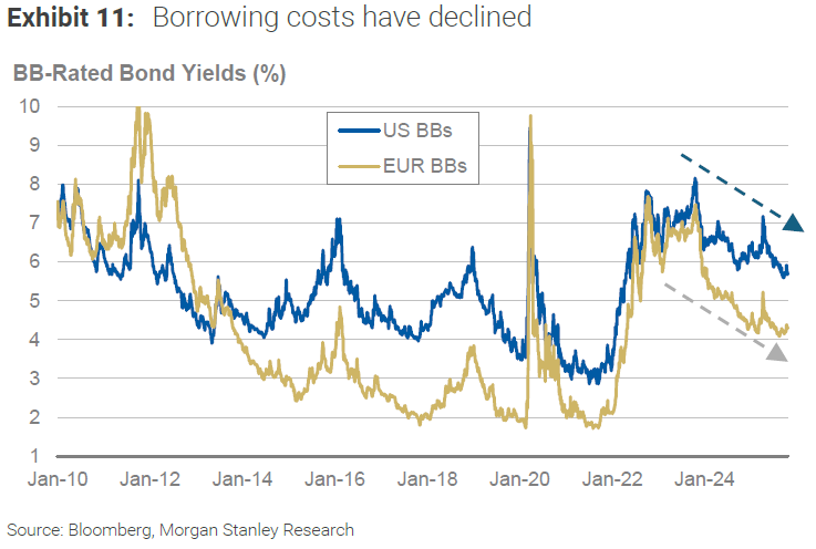 En la parte de la deuda, tanto IG como HY, la demanda estructural (seguros, mutual funds, CLOs) mantiene spreads comprimidas incluso tras meses de oferta récord; en levfin, los underwriters vuelven a abrir ventanas para LBOs selectivos con estructuras disciplinadas (más equity que en 2006–07). En paralelo, el direct lending sigue supercompetitivo y habilita cierres ágiles sin riesgo de sindicación. El M&A optionality favorece bonos con cláusulas de cambio de control a 101 y pricing por debajo de par.
