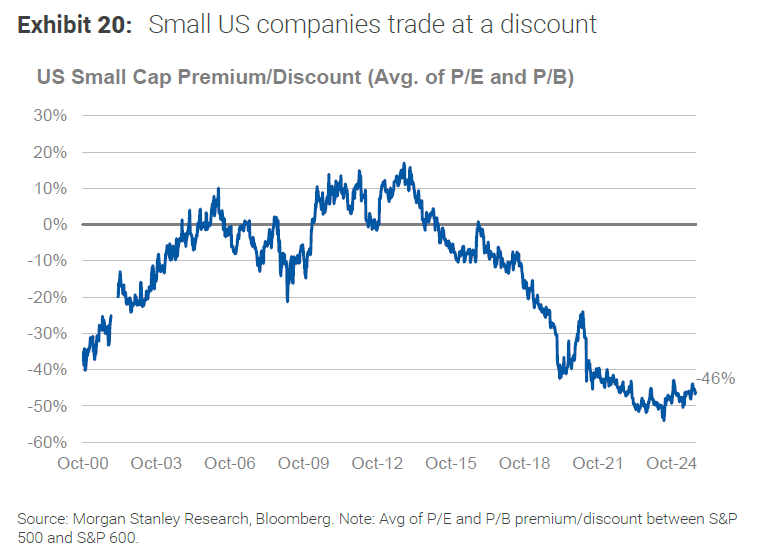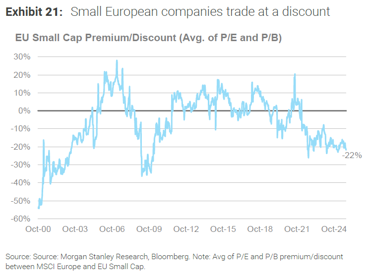 Tras años de liderazgo de megacaps, las small y mid caps cotizan a descuentos históricos versus las grandes: en EE. UU., métricas como P/E o P/B muestran gaps no vistos desde finales de los 90; análisis de sell-side y casas de índices hablan de descuentos del 20–45% según metodología y periodo. En Europa, aunque el descuento es menor, las small caps también presentan descuento frente a las grandes compañías, cuando históricamente no ha sido así. Eso convierte a las SMIDs en “targets de valor” y/o en plataformas de consolidación sectorial.