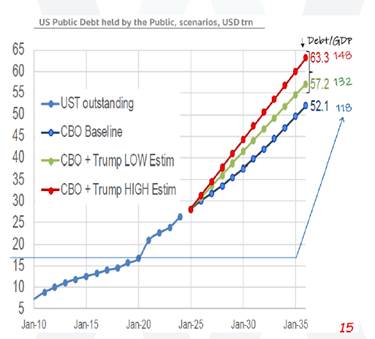 Ese movimiento contagiaría rápidamente al resto del sistema financiero global, elevando el coste del capital justo cuando gobiernos y empresas ya están muy endeudados. Las emisiones netas anuales de EE. UU. rondan los 2,3 billones de dólares, y su deuda podría pasar de unos 30 billones a cerca de 60 billones en 2035. Estados Unidos depende de una base sólida de inversores para absorber ese volumen de deuda y, además, necesita hacerlo a costes controlados.